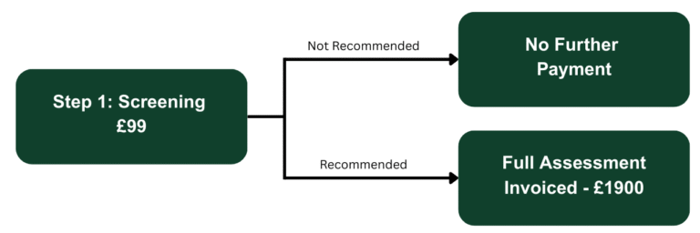 Autism assessment is a significant financial commitment, and we want you to feel supported and informed throughout the process. The flow chart below outlines how our model works. Our pathway begins with a screening appointment (see What to expect for details), with a £99 fee payable at the point of booking. If we recommend a full assessment and you choose to proceed, the remaining £1900 will be invoiced to you. If we do not recommend a full assessment, or if you decide not to continue, there is no further payment, and you will receive a letter summarising the screening appointment.